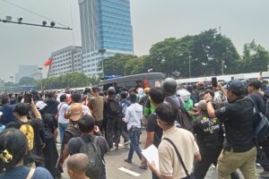 Seperti yang terpantau, Senin (25/8), massa mengisi Jalan Pejompongan Raya, khususnya di bawah flyover Palmerah. Mereka sesekali melempar batu maupun botol kaca ke arah petugas.